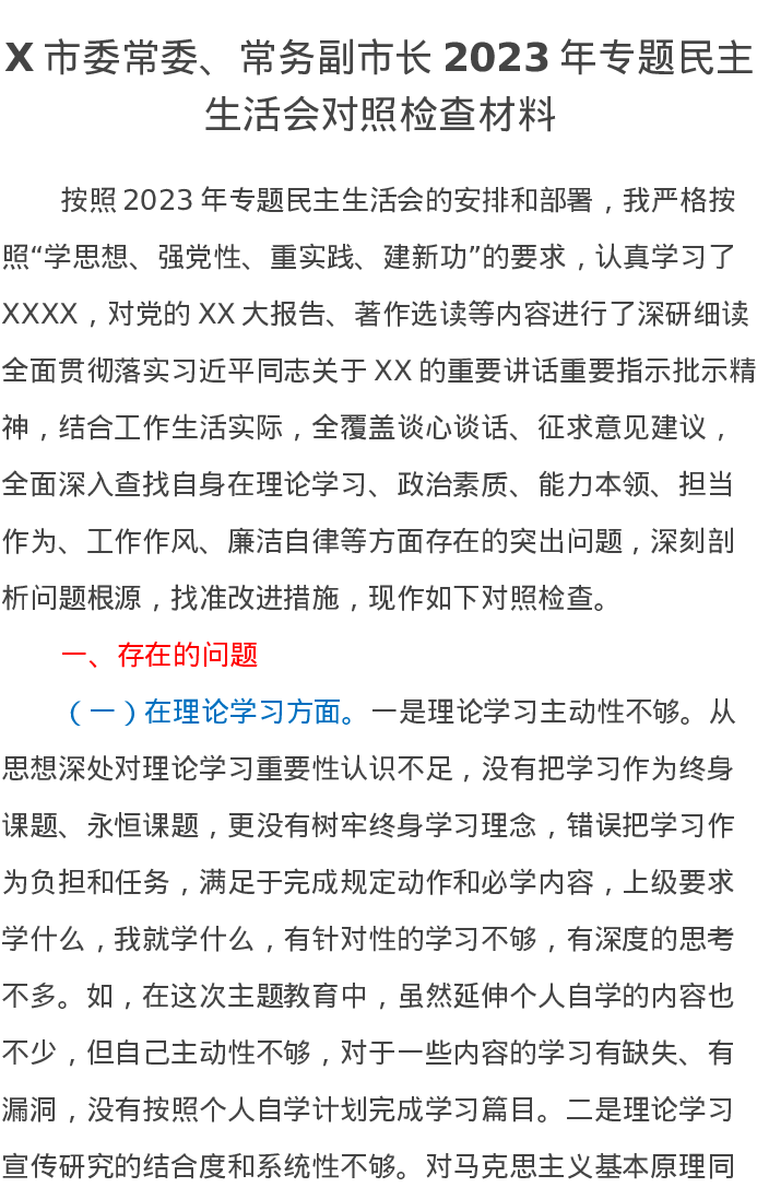 X市委常委、常务副市长2023年专题民主生活会对照检查材料