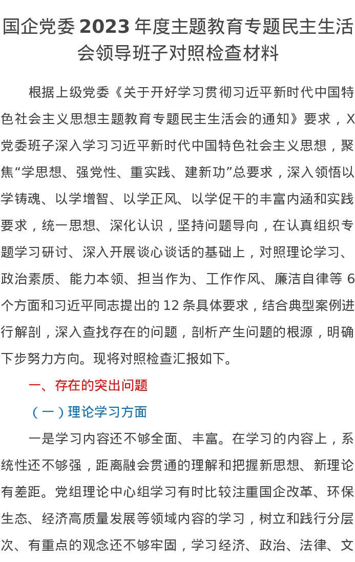国企党委2023年度第二批主题教育专题民主生活会领导班子对照检查材料(特色社会主义思想)