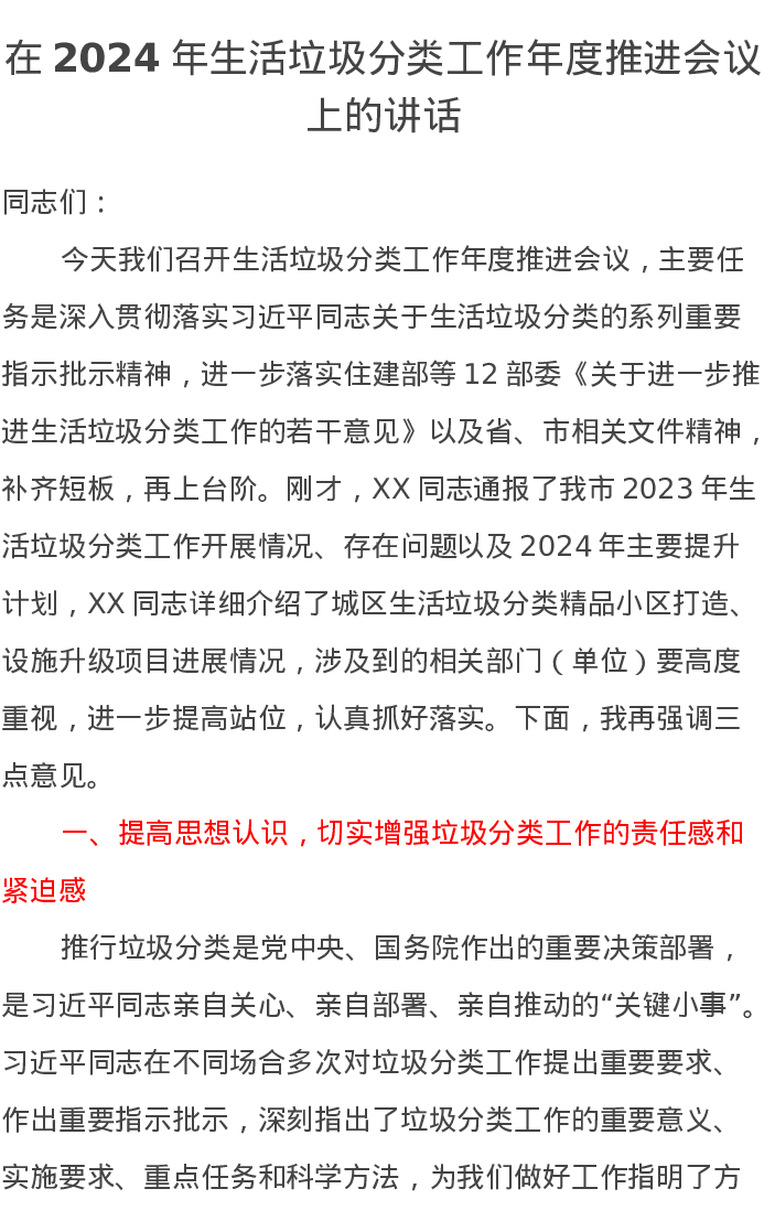 在2024年生活垃圾分类工作年度推进会议上的讲话