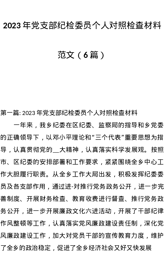 汇编:2023年党支部纪检委员个人对照检查材料6篇