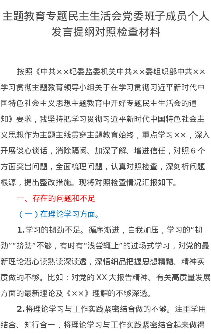 第二批主题教育专题民主生活会党委班子成员个人发言提纲对照检查材料(特色社会主义思想)