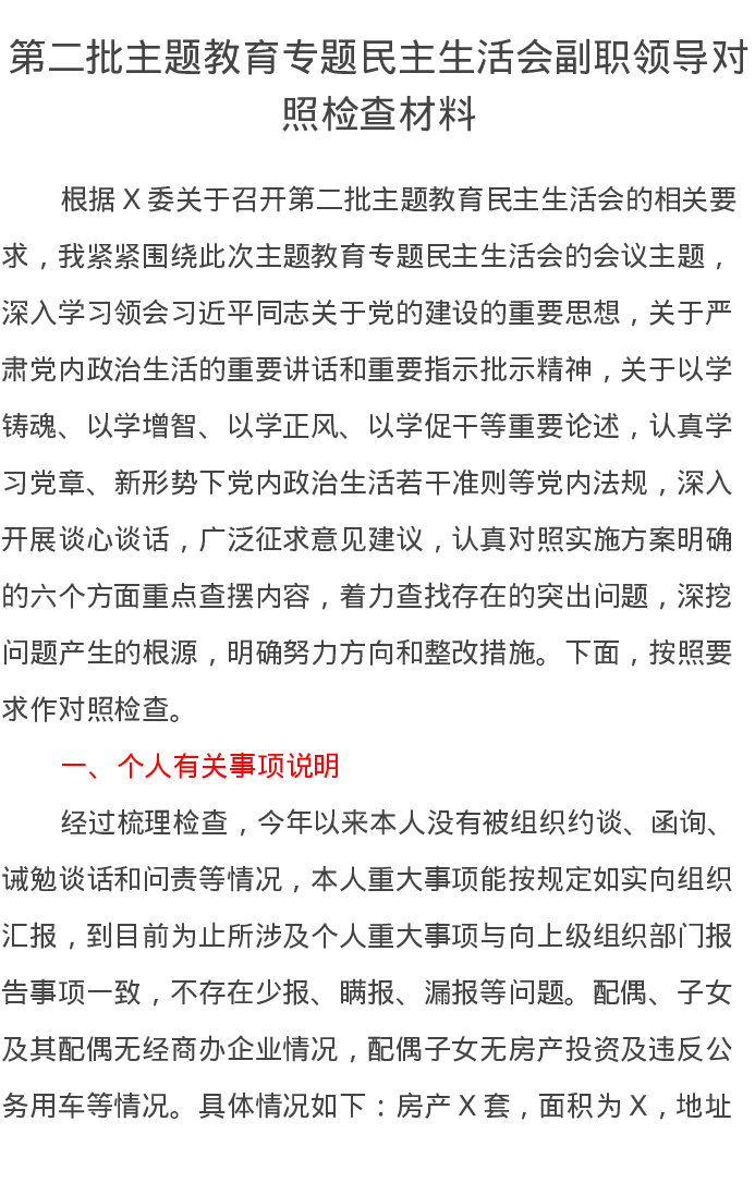 第二批主题教育专题民主生活会副职领导对照检查材料(特色社会主义思想)