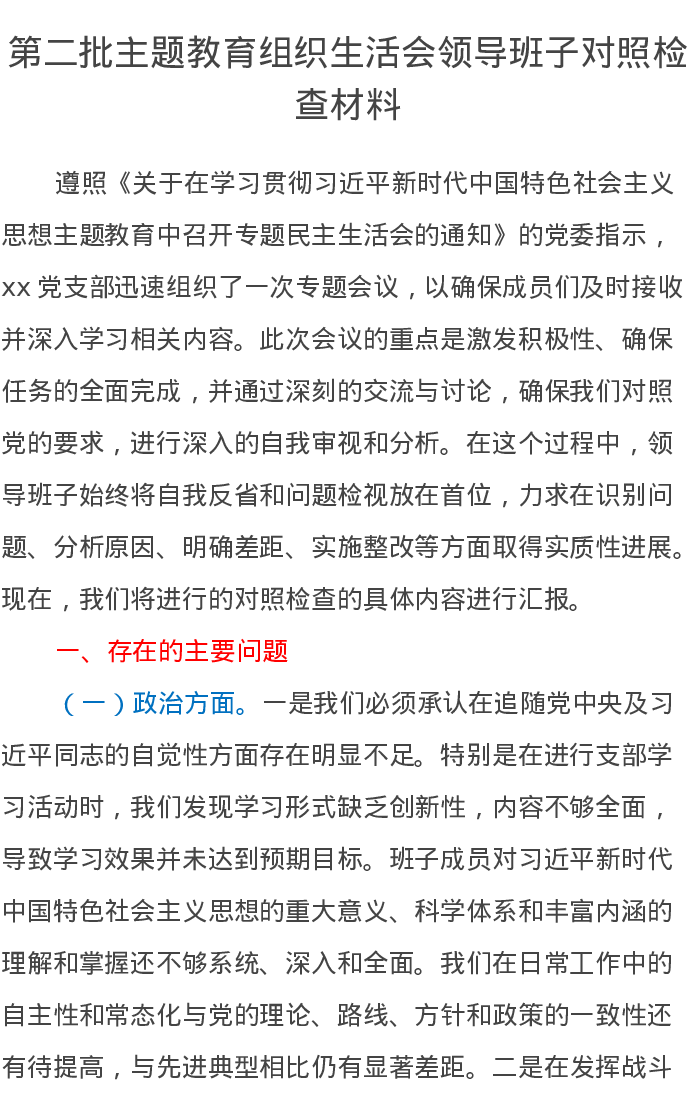 第二批主题教育组织生活会领导班子对照检查材料
