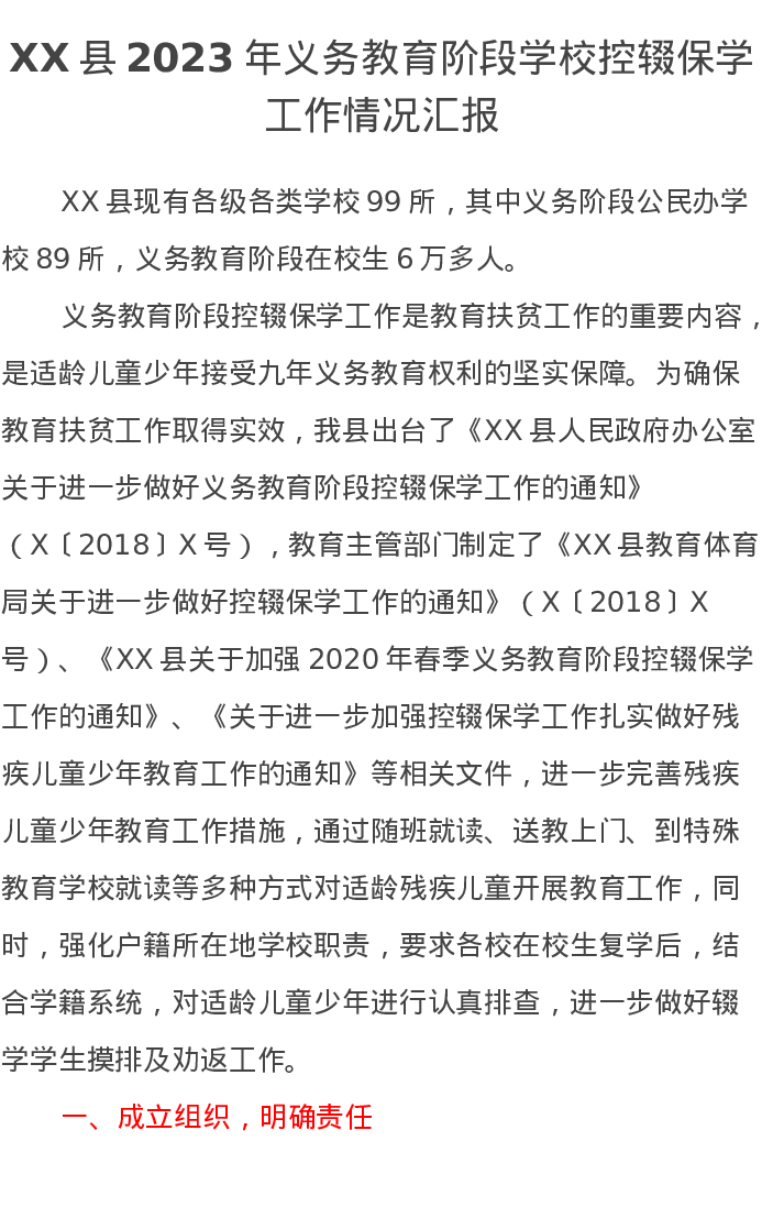 XX县2023年义务教育阶段学校控辍保学工作情况汇报