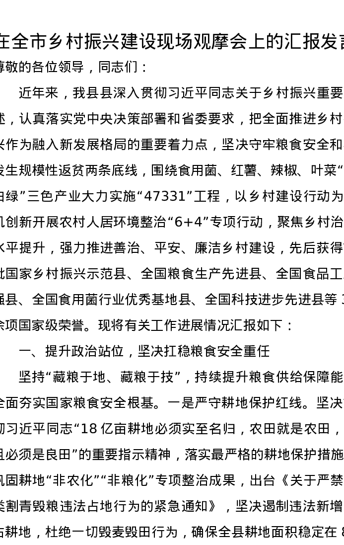 在全市乡村振兴建设现场观摩会上的汇报发言