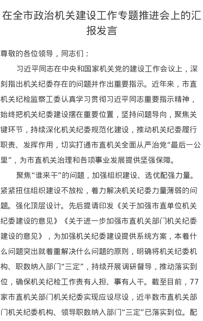 在全市政治机关建设工作专题推进会上的汇报发言