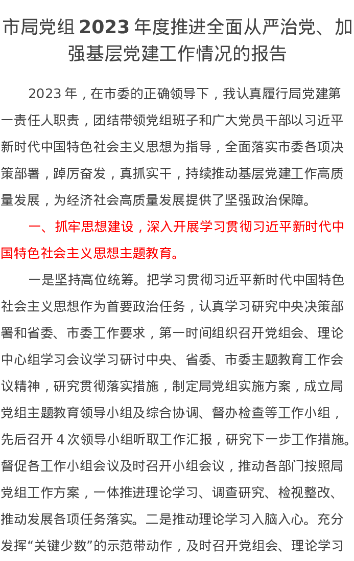 市局党组2023年度推进全面从严治党、加强基层党建工作情况的报告