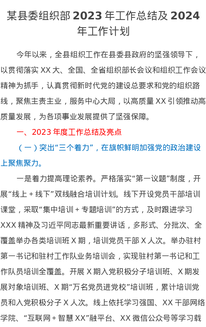 某县委组织部2023年工作总结及2024年工作计划