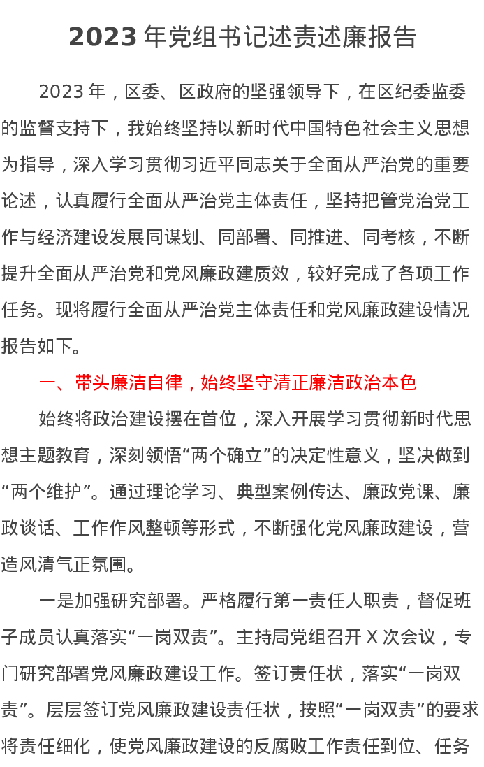 2023年党组书记述责述廉报告