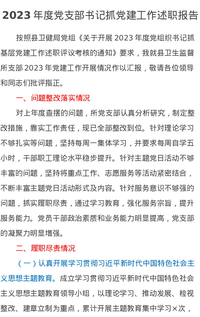 2023年度党支部书记抓党建工作述职报告