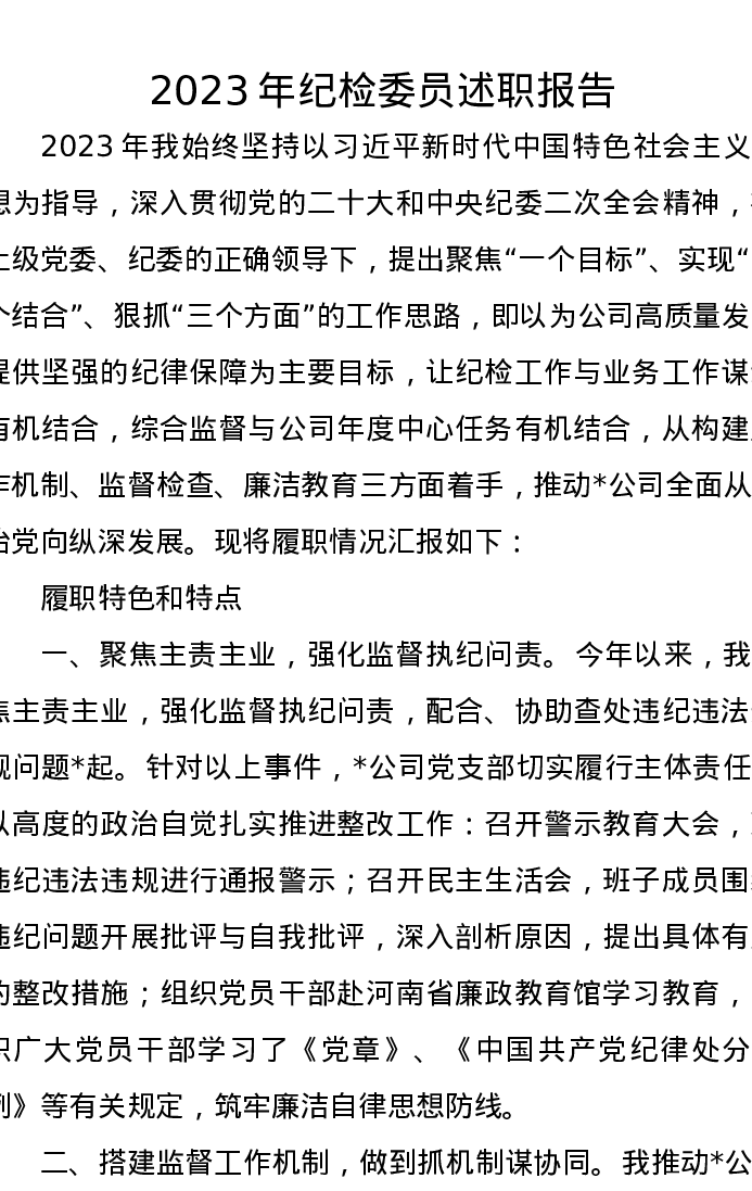 2023年纪检委员述职报告