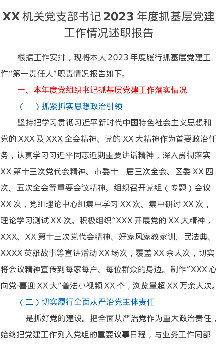 XX机关党支部书记2023年度抓基层党建工作情况述职报告