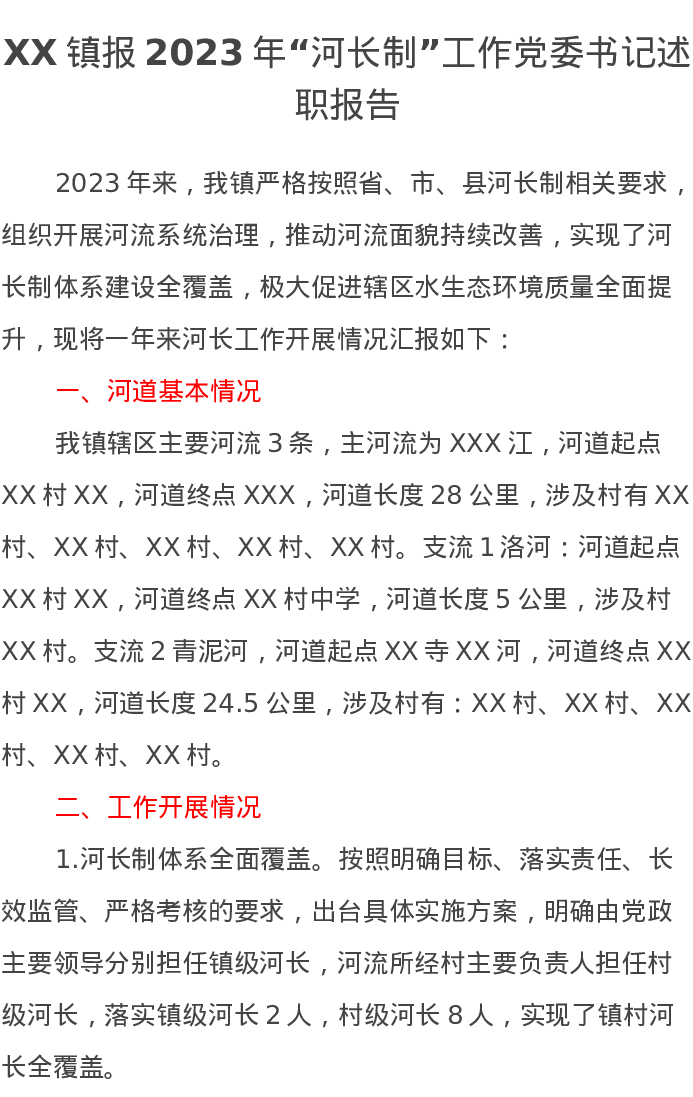 XX镇报2023年“河长制”工作党委书记述职报告