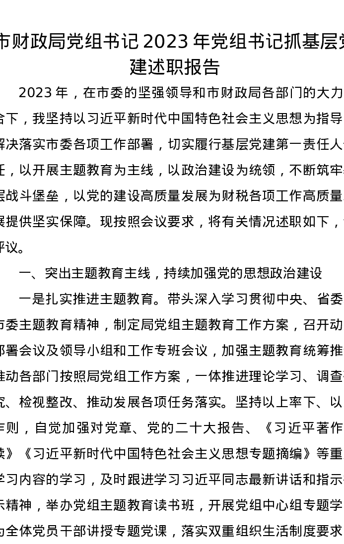 市财政局党组书记2023年党组书记抓基层党建述职报告