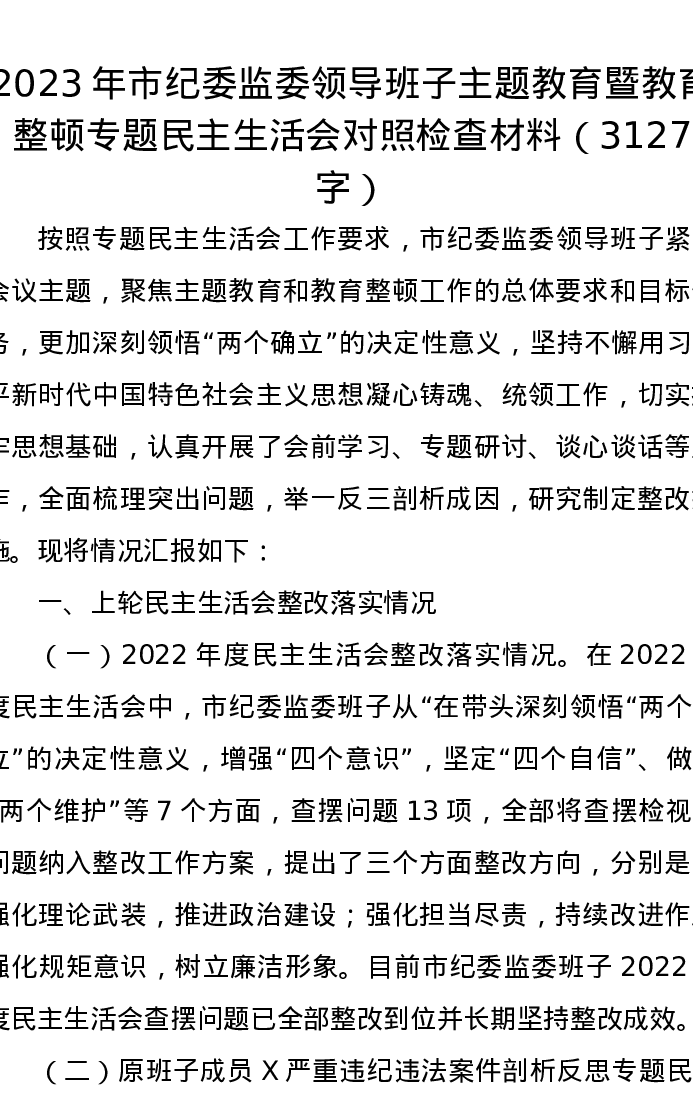2023年市纪委监委领导班子主题教育暨教育整顿专题民主生活会对照检查材料(特色社会主义思想)