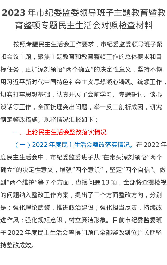 2023年市纪委监委领导班子第二批主题教育暨教育整顿专题民主生活会对照检查材料(特色社会主义思想)