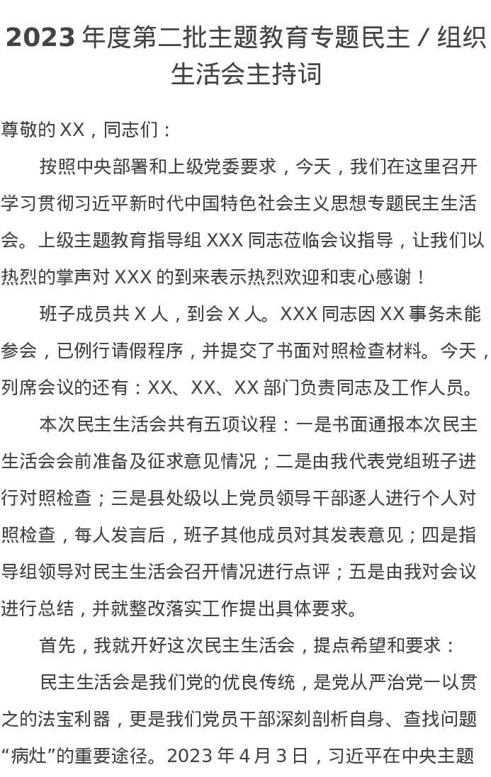 2023年度第二批主题教育专题民主/组织生活会主持词(特色社会主义思想)