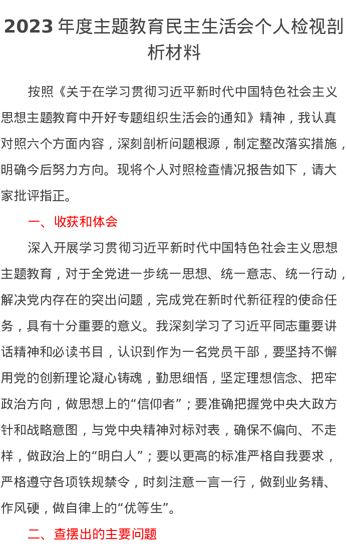 2023年度第二批主题教育民主生活会个人检视剖析材料(特色社会主义思想)