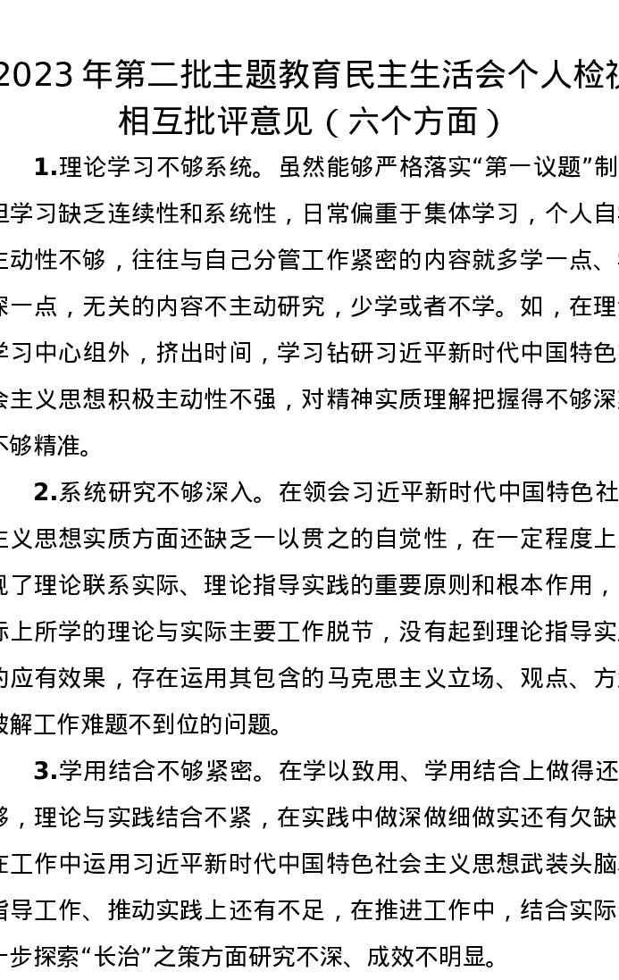 2023年第二批主题教育民主生活会个人检视、相互批评意见((特色社会主义思想六个方面)