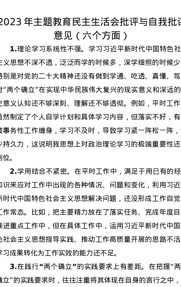 2023年第二批主题教育民主生活会批评与自我批评意见((特色社会主义思想六个方面)