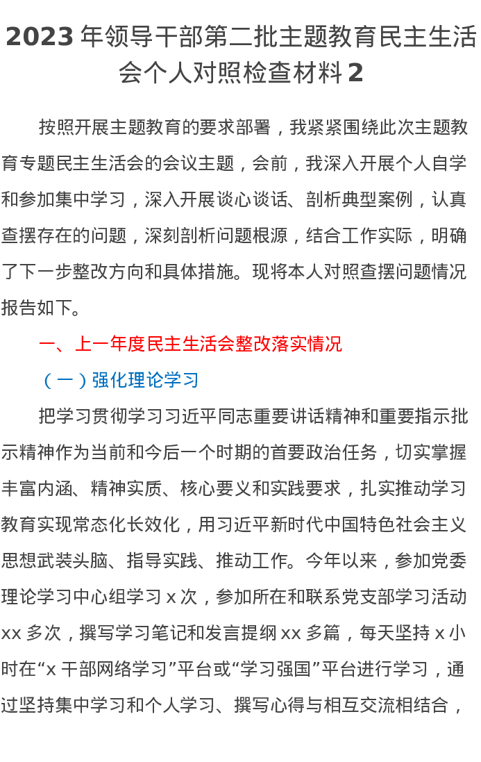 2023年领导干部第二批主题教育民主生活会个人对照检查材料2(特色社会主义思想)