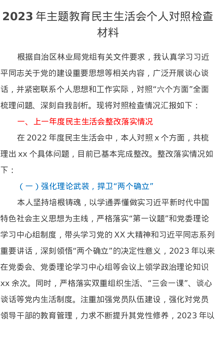 2023年领导干部第二批主题教育民主生活会个人对照检查材料8(特色社会主义思想)