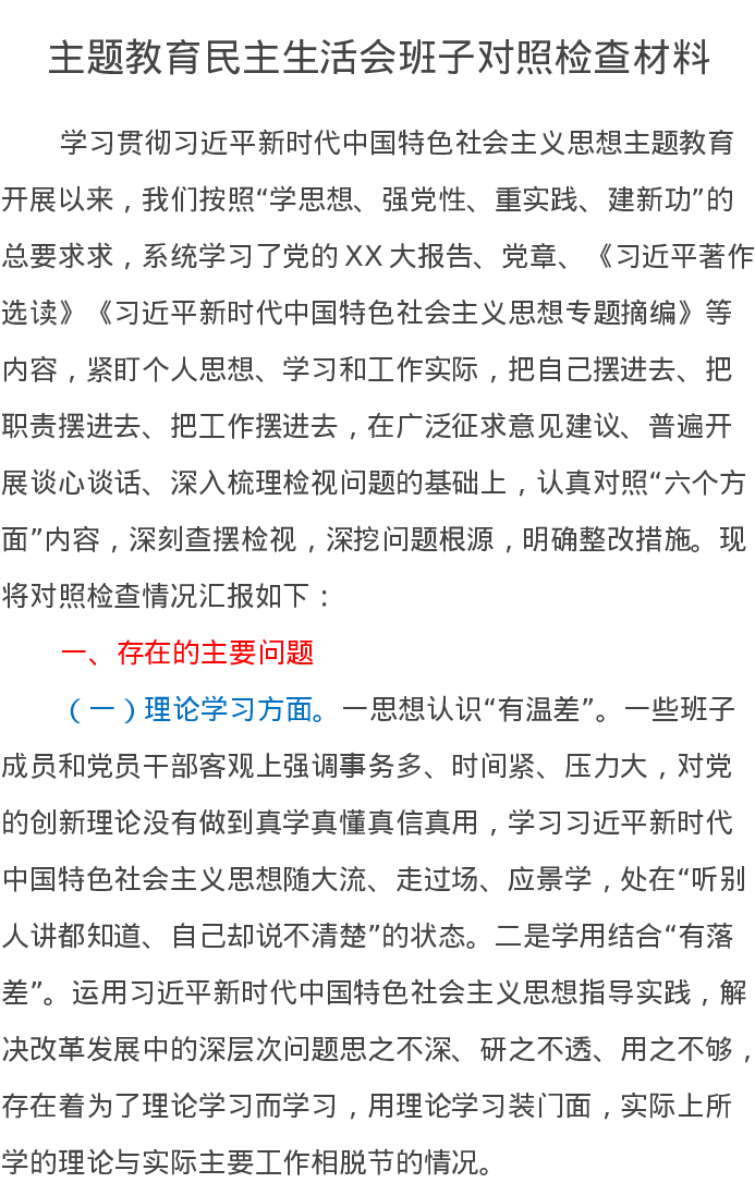 主题教育民主生活会班子对照检查材料(特色社会主义思想)