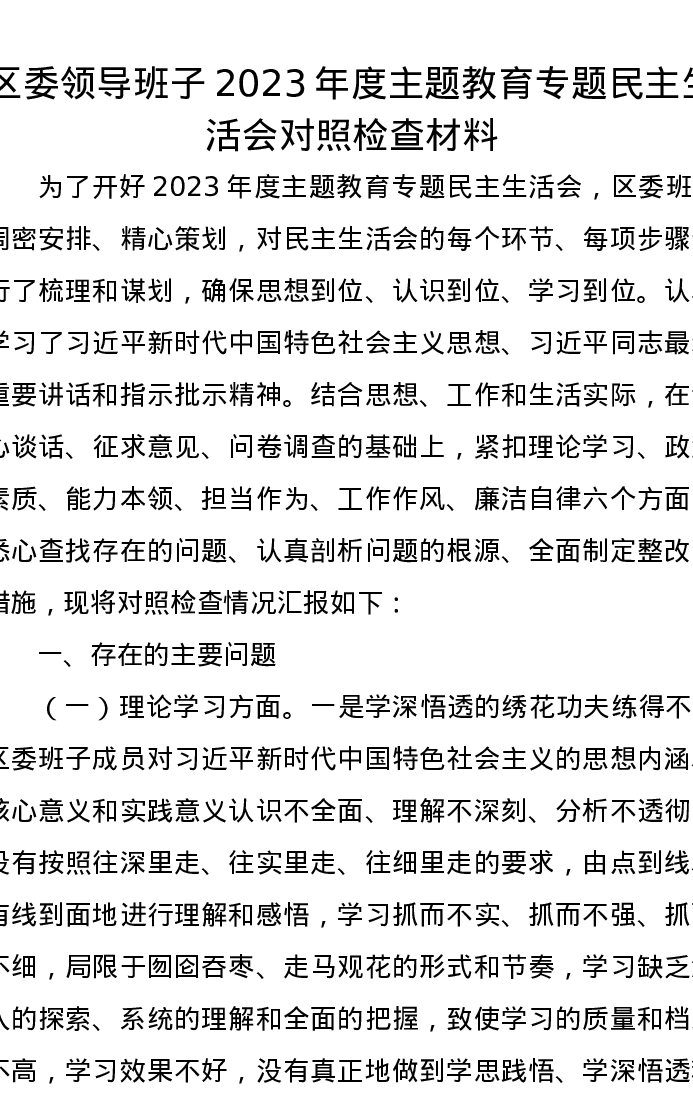 区委领导班子2023年度第二批主题教育专题民主生活会对照检查材料(特色社会主义思想)