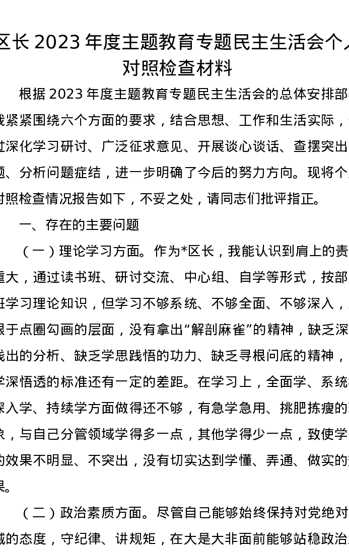 区长2023年度第二批主题教育专题民主生活会个人对照检查材料(特色社会主义思想)
