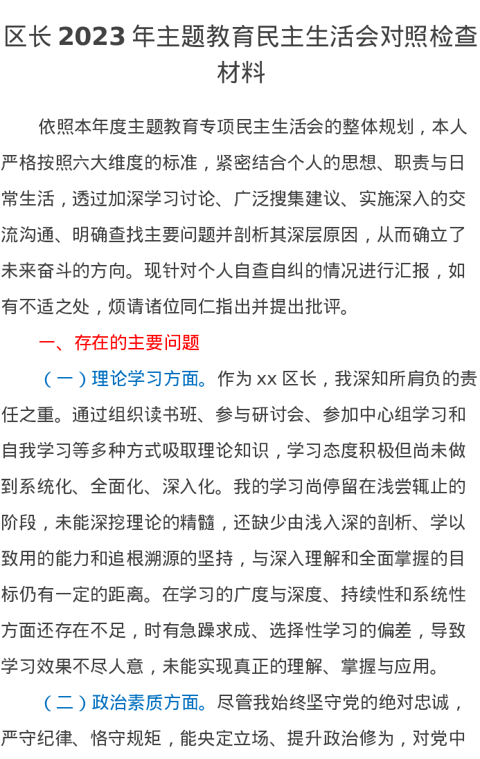 区长2023年第二批主题教育民主生活会对照检查材料(特色社会主义思想)