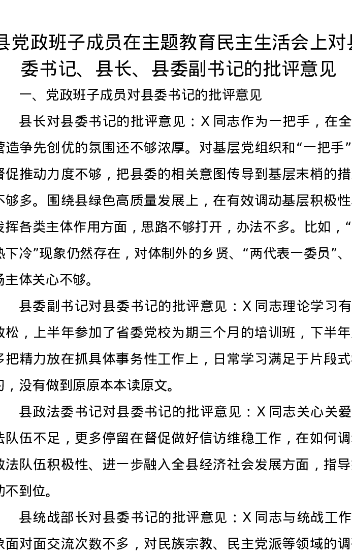 县党政班子成员在第二批主题教育民主生活会上对县委书记、县长、县委副书记的批评意见(特色社会主义思想)