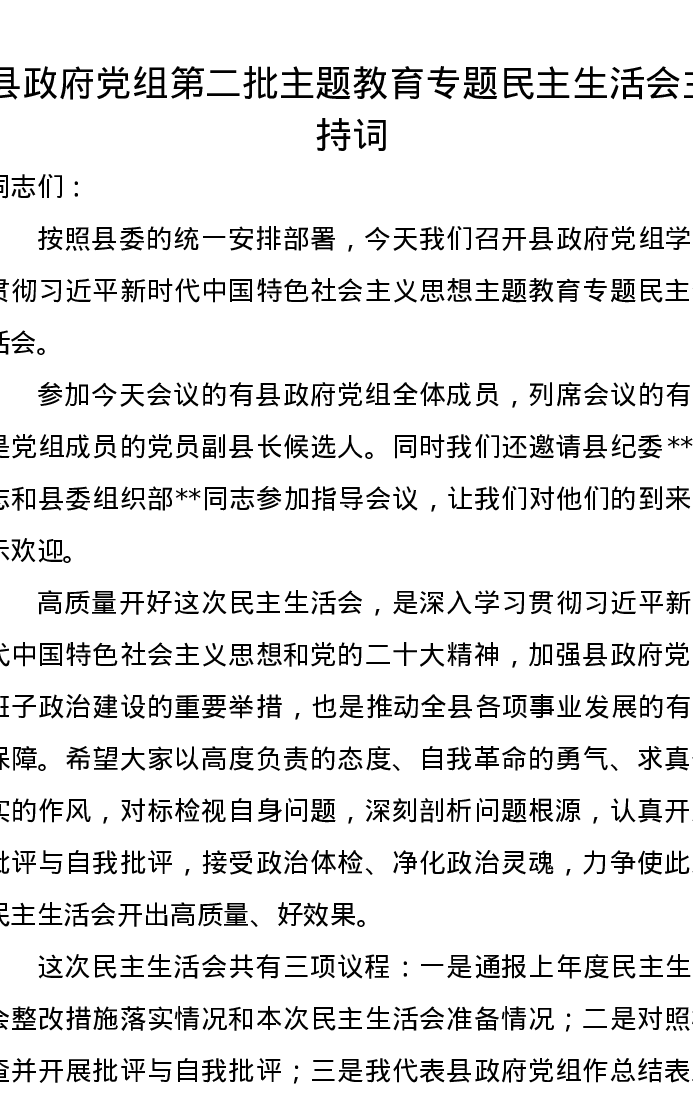 县政府党组第二批主题教育专题民主生活会主持词(特色社会主义思想)