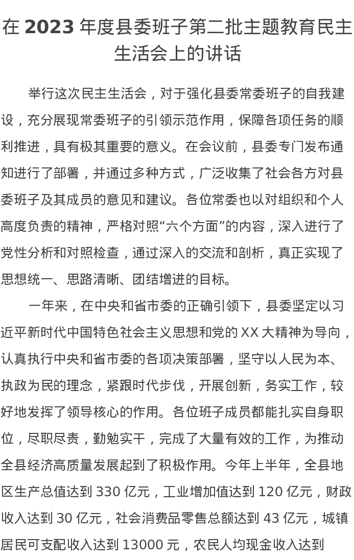 在2023年度县委班子第二批主题教育民主生活会上的讲话(特色社会主义思想)