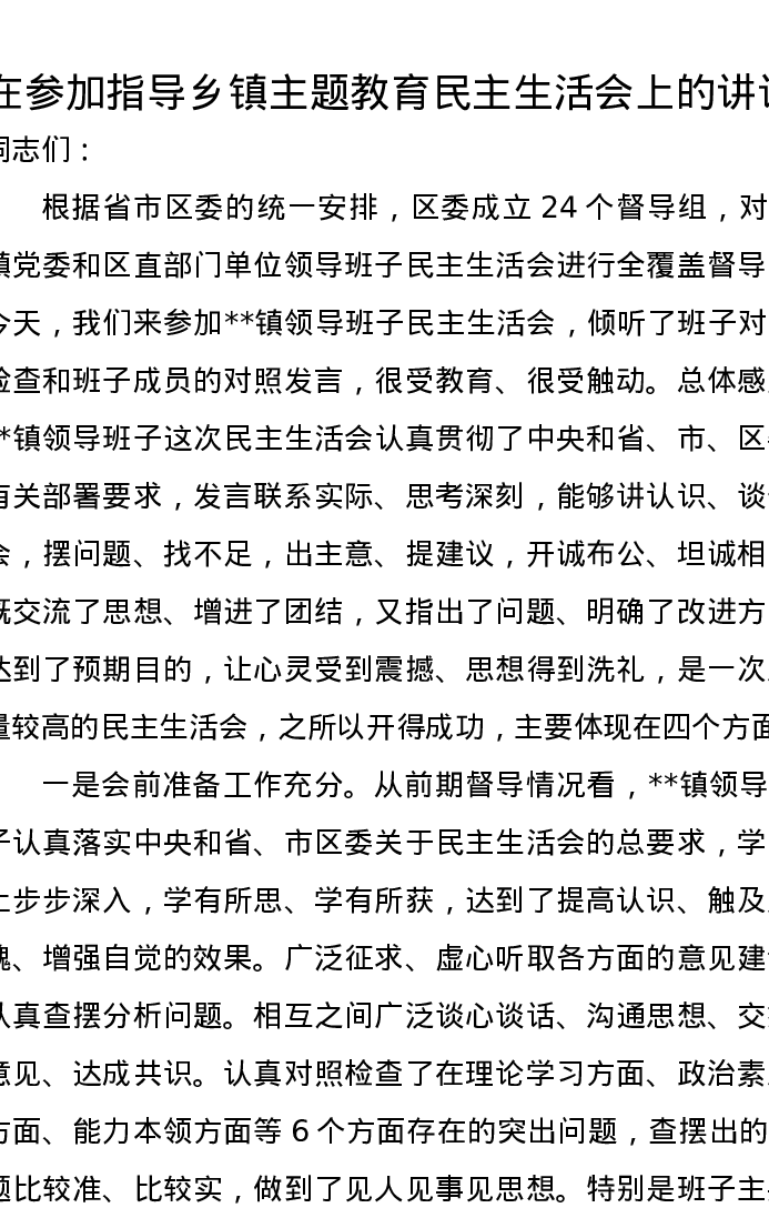 在参加指导乡镇第二批主题教育民主生活会上的讲话(特色社会主义思想)
