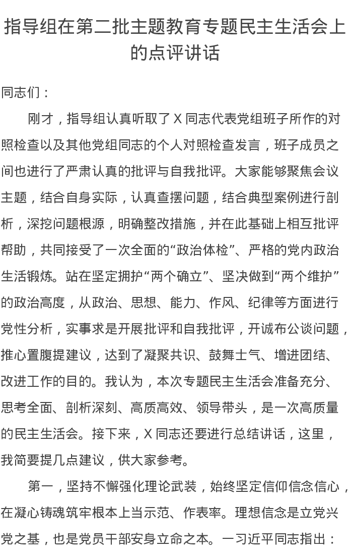 指导组在第二批主题教育专题民主生活会上的点评讲话(特色社会主义思想)