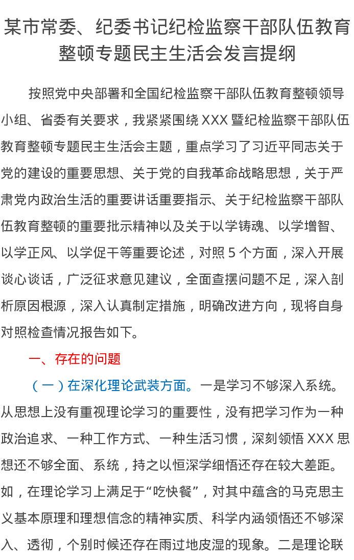 某市常委、纪委书记纪检监察干部队伍教育整顿专题民主生活会发言提纲