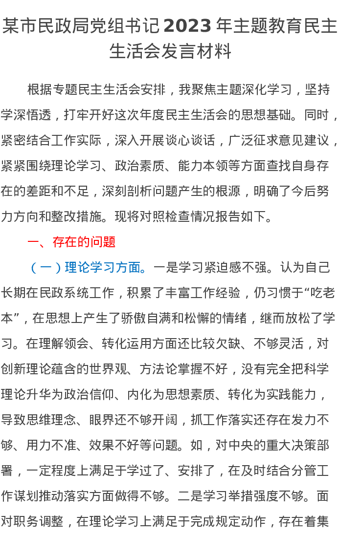 某市民政局党组书记2023年第二批主题教育民主生活会发言材料(特色社会主义思想)