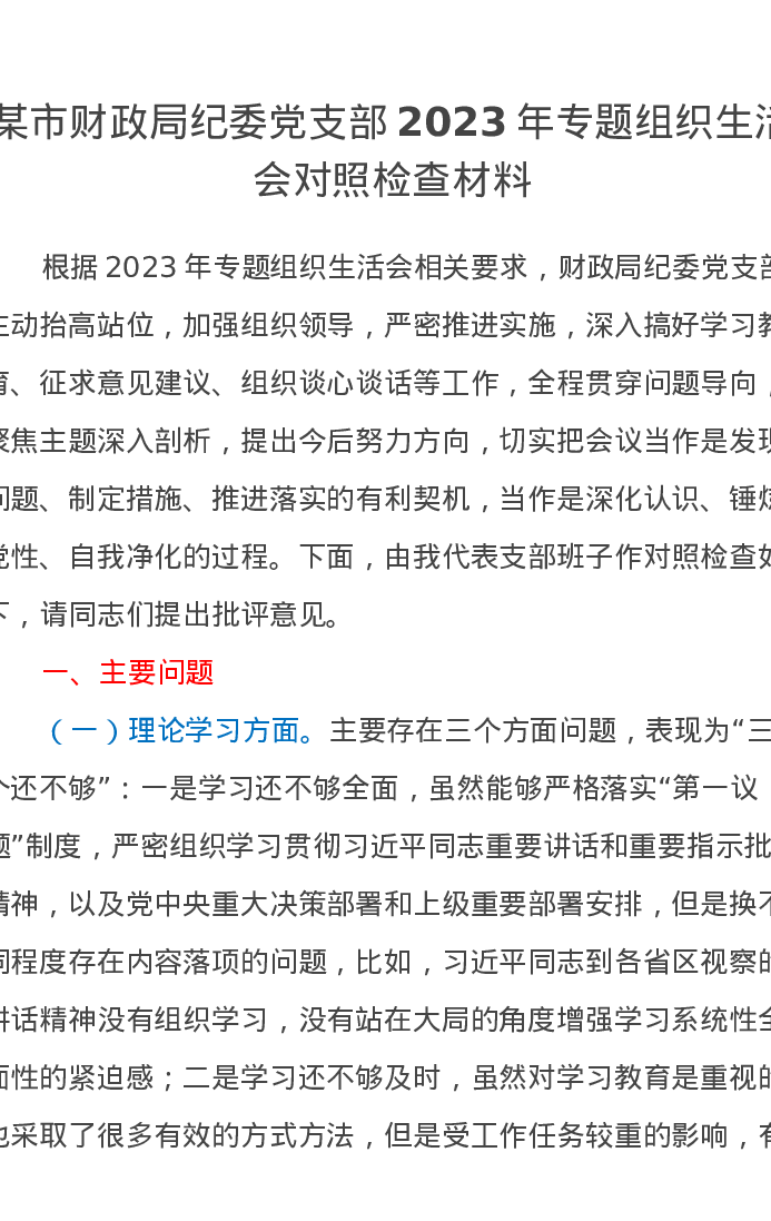 某市财政局纪委党支部2023年专题组织生活会对照检查材料