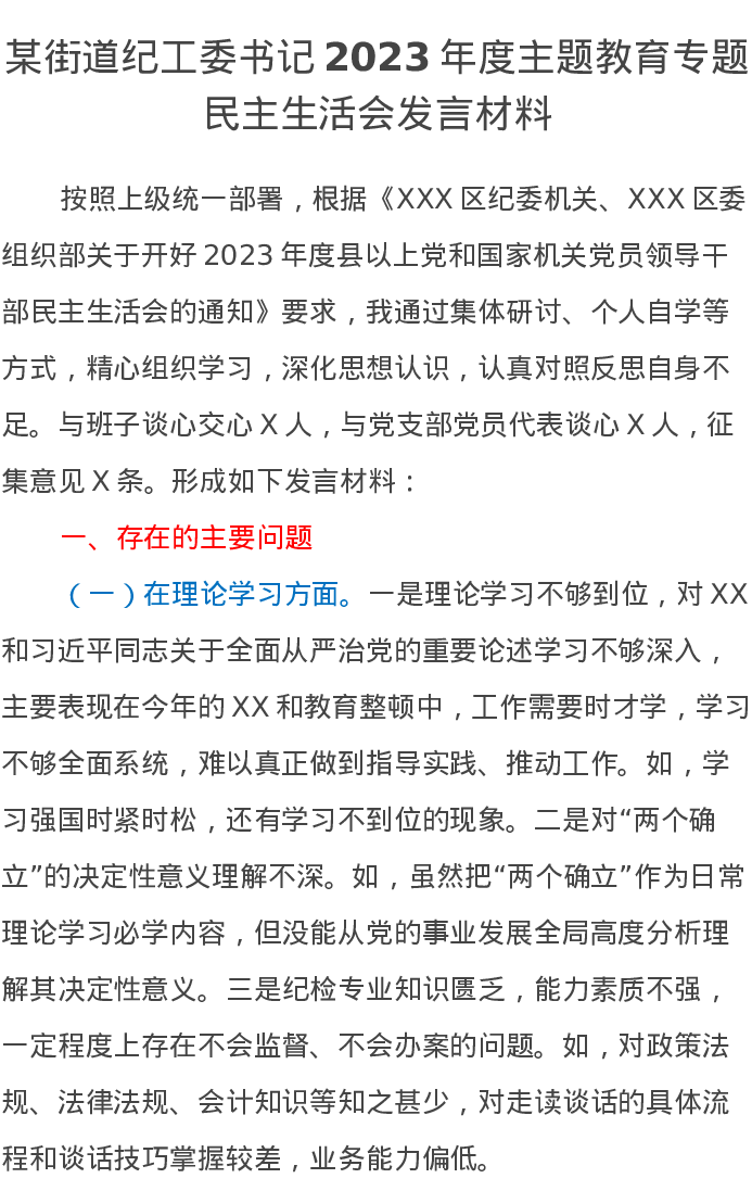 某街道纪工委书记2023年第二批主题教育专题民主生活会发言材料(特色社会主义思想)