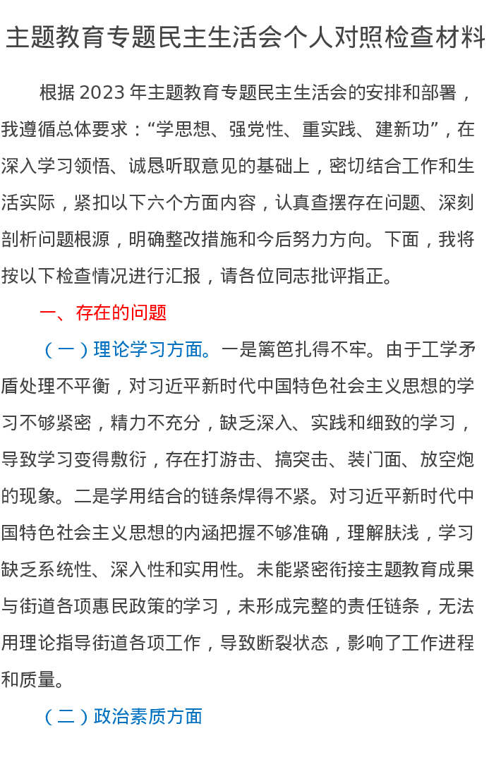 第二批主题教育专题民主生活会个人对照检查材料(特色社会主义思想)