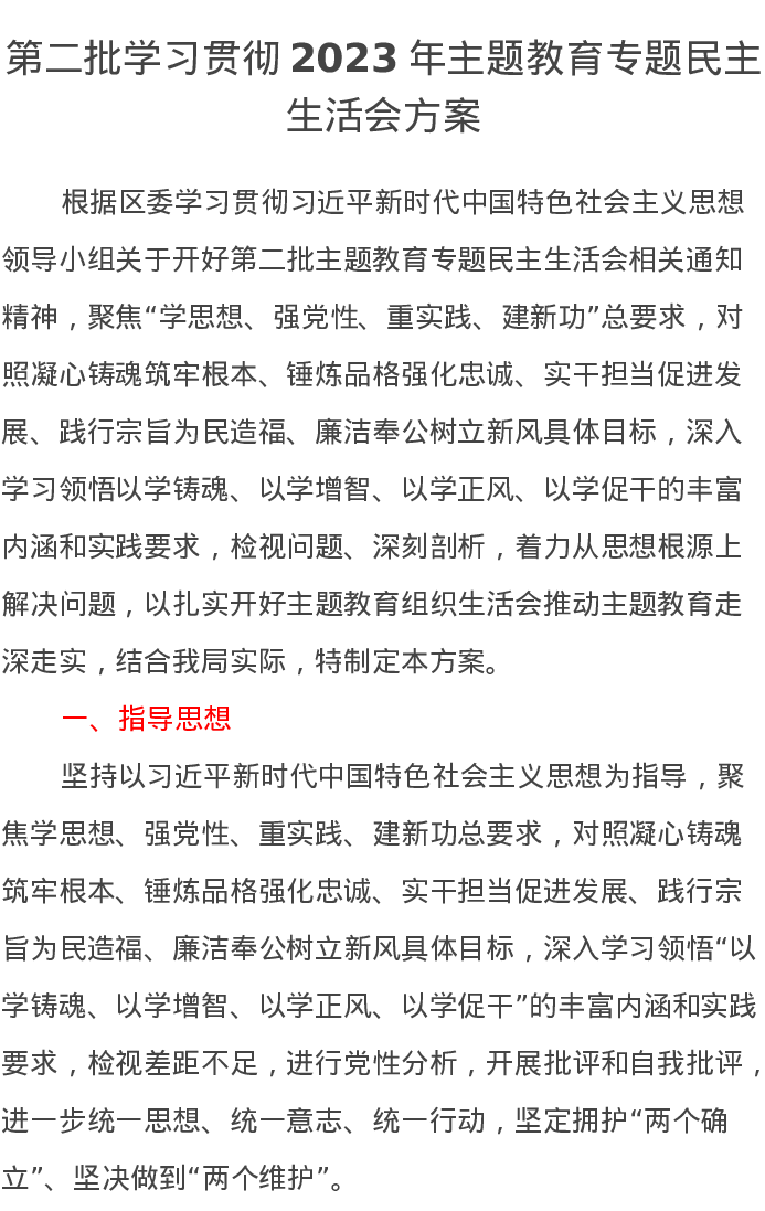 第二批学习贯彻2023年主题教育专题民主生活会方案(特色社会主义思想)