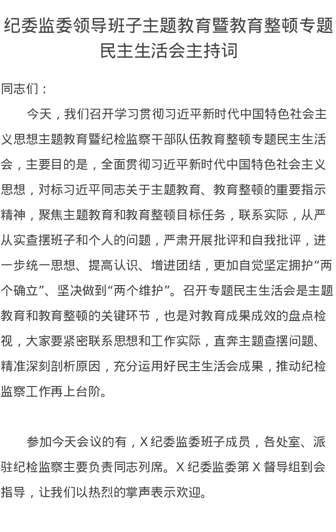 纪委监委领导班子主题教育暨教育整顿专题民主生活会主持词(特色社会主义思想)