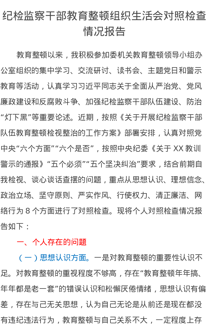 纪检监察干部教育整顿组织生活会对照检查情况报告