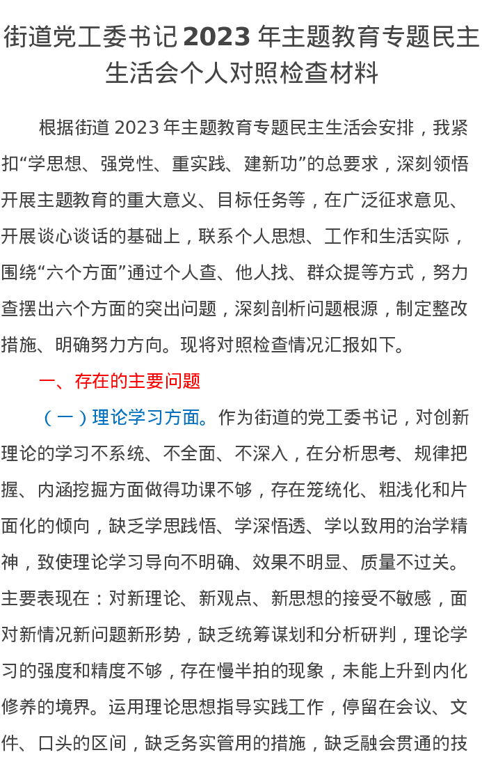 街道党工委书记2023年主题教育专题民主生活会个人对照检查材料(特色社会主义思想)