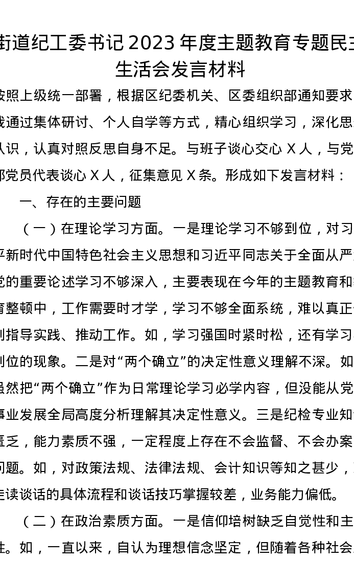 街道纪工委书记2023年第二批主题教育专题民主生活会发言材料(特色社会主义思想)