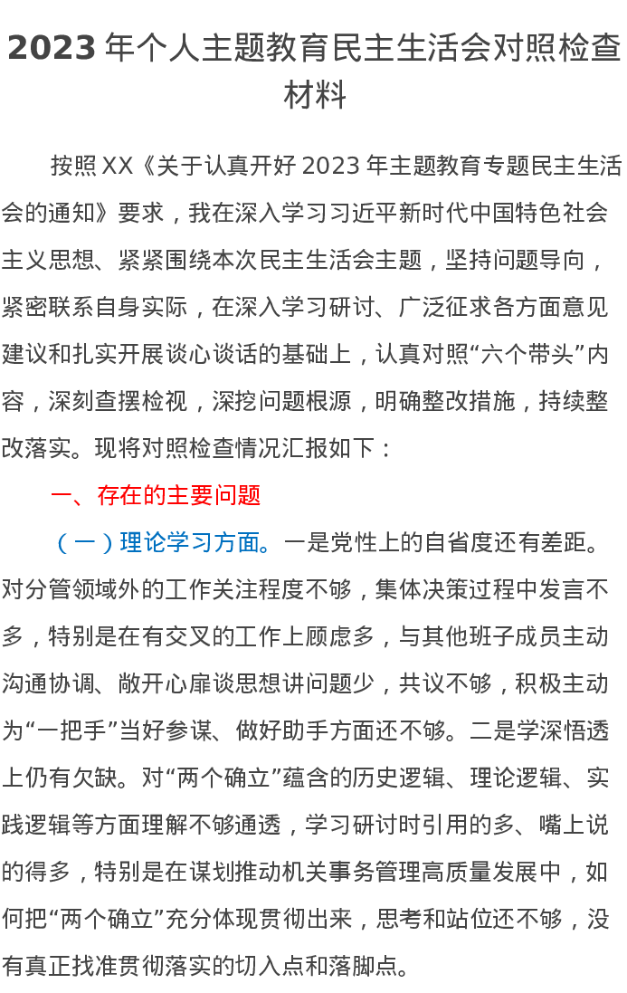 2023年个人第二批主题教育民主生活会对照检查材料(特色社会主义思想)