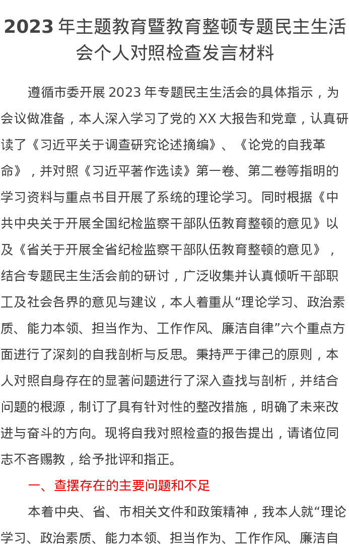 2023年主题教育暨教育整顿专题民主生活会个人对照检查发言材料(特色社会主义思想)