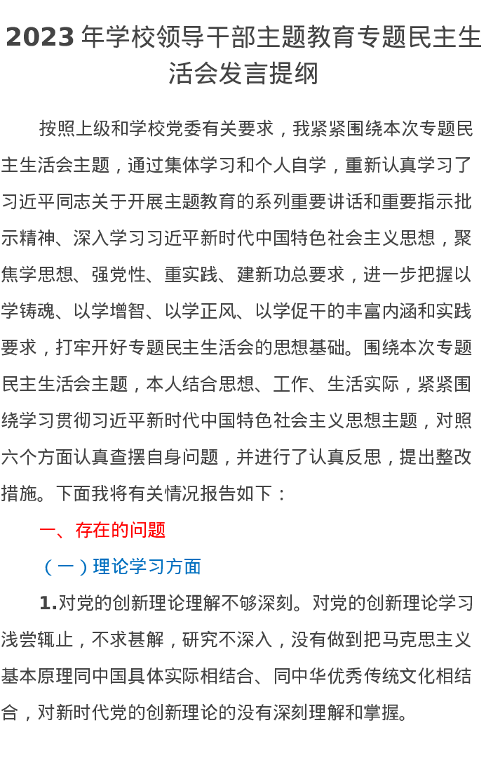 2023年学校领导干部第二批主题教育专题民主生活会发言提纲(特色社会主义思想)