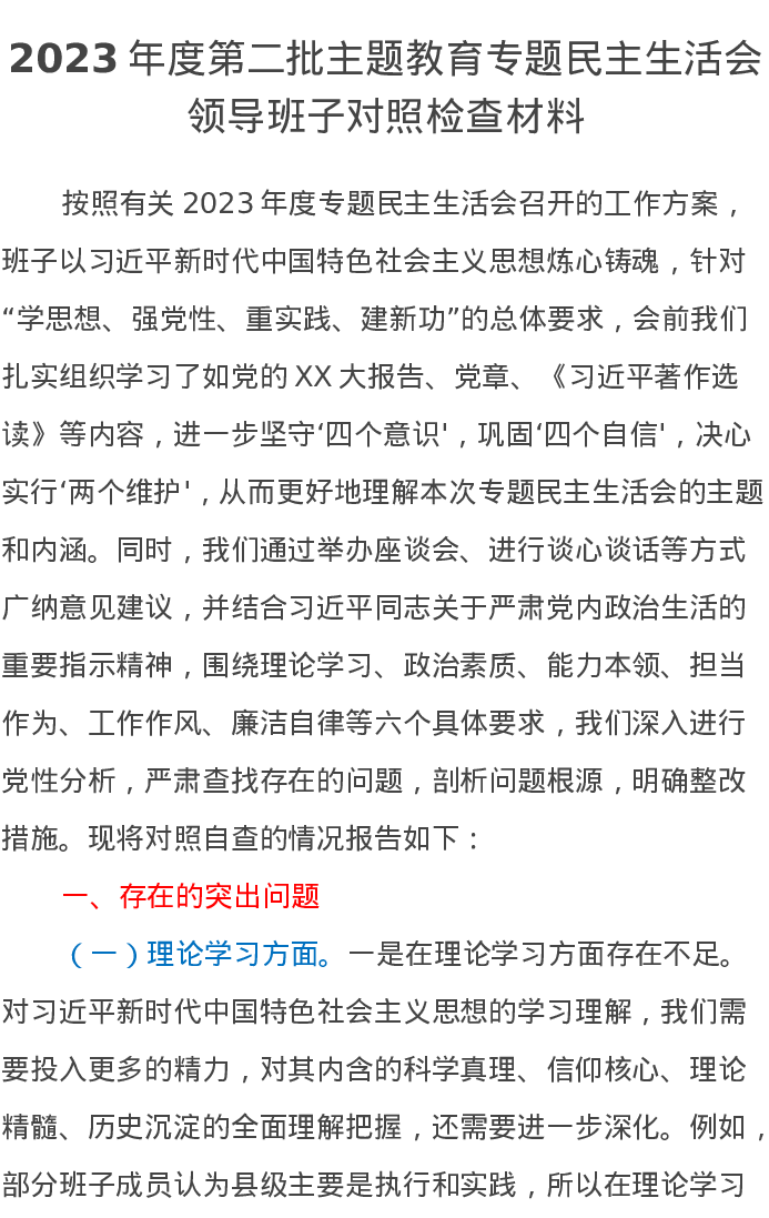 2023年度第二批主题教育专题民主生活会领导班子对照检查材料(特色社会主义思想)