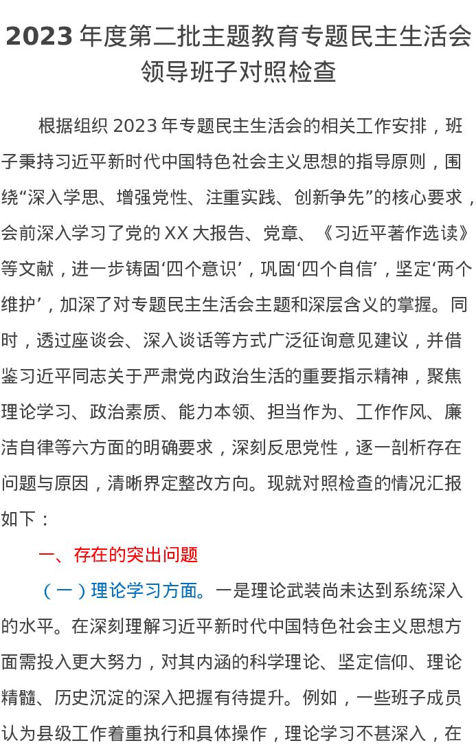 2023年度第二批主题教育专题民主生活会领导班子对照检查(特色社会主义思想)